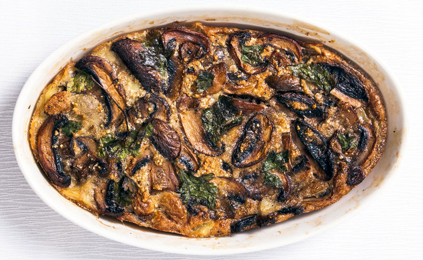 שפע פטריות מסוגים שונים מוקפצות בשמן זית ומתובלות בשום, מלח, המון פלפל שחור וחשוב מאוד: קליפת לימון. ביצים ותפוח אדמה קושרים את התערובת ומבטלים את הצורך בתחליפי קמח.